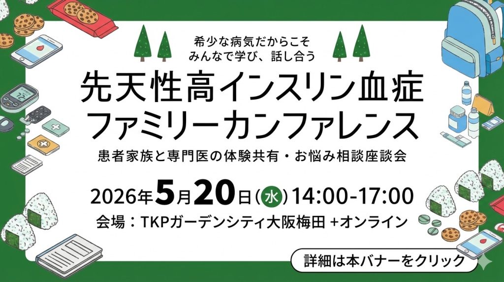 本サイトでは、希少難治性疾患である高インスリン血性低血糖症(先天性高インスリン血症、膵島細胞症)の患者と家族および関わってくださる全ての方に向けて、患者会からの情報発信、入会のご案内、お問合せ受付を行っています。